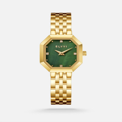 ساعة نسائية من ماركة إلڤي بسير من الستانلس ستيل باللون الذهبي ، ساعة بتصميم جذاب ، تتميز الساعة بالميناء الأنيق بإطار هندسي باللون الأخضر وبعدد من فصوص الزركون في مكان الأرقام ، بلاشك ستكون هذه الساعه هي القطعه المناسبة لأرتدائها في كل الأوقات . ضمان سنة