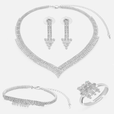 - يتميز الطقم بتصميمه الذي يتزين بحلي متتابعة مرصعة بفصوص و أحجار من الزركون اللامع