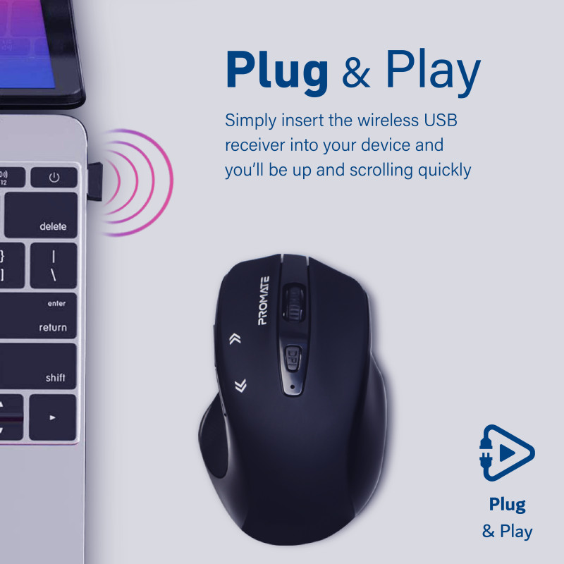 احصل على اتصال نهائي من خلال اتصال 2.4 جيجا هرتز الذي لا يوفر أي انقطاع لاسلكي أو تداخلات من الأجهزة اللاسلكية الأخرى. يوفر لك مؤشر Promate اتصالاً مستقرًا وقويًا حتى لا تفوتك أي نقرة.