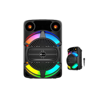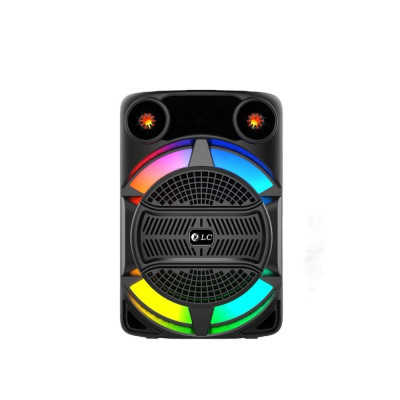 مكبر صوت (سماعة) محمول من نوع "BT PORTABLE SPEAKER" من ماركة "DLC". يتميز بتصميم عصري وجريء باللون الأسود، مع شبك حماية أمامي ومقابض في الأعلى لسهولة الحمل. الواجهة الأمامية للمكبر تتميز بإضاءة LED ديناميكية وملونة على شكل قوس قزح، مما يضفي عليه مظهرًا جذابًا وحيويًا.