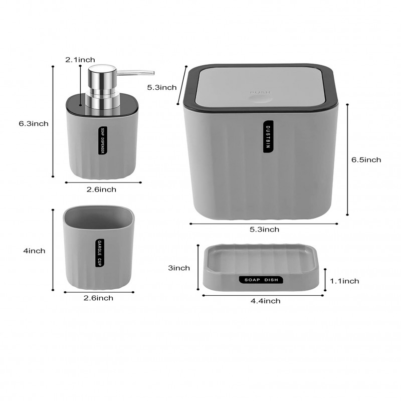- سلة المهملات: 14x14x16 سم وعاء الصابون: 13x8x2 سم وموزع اللوشن: 7x7x17 سم والكوب: 7x7x10 سم