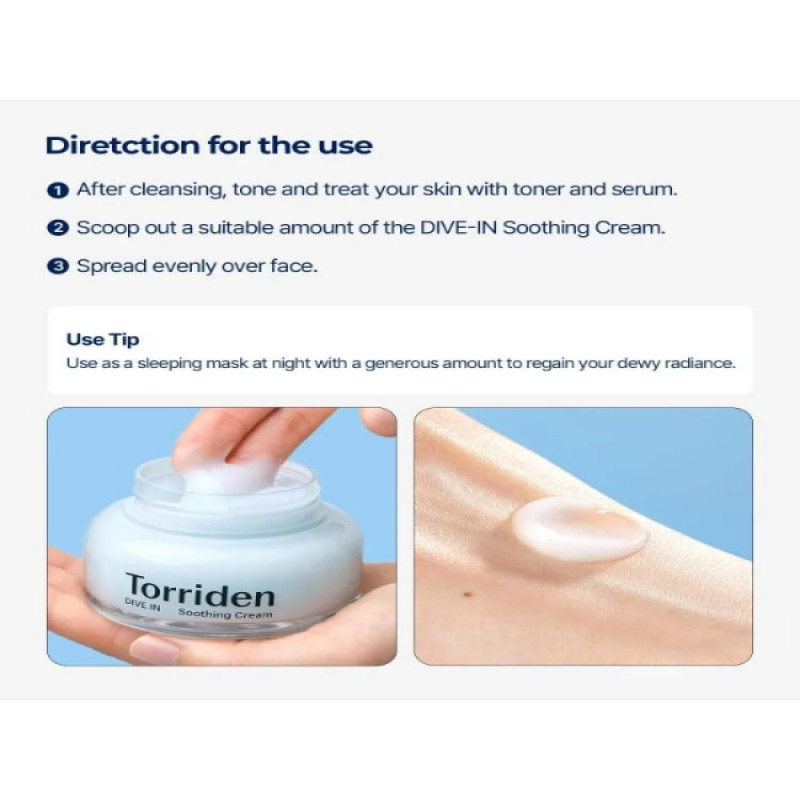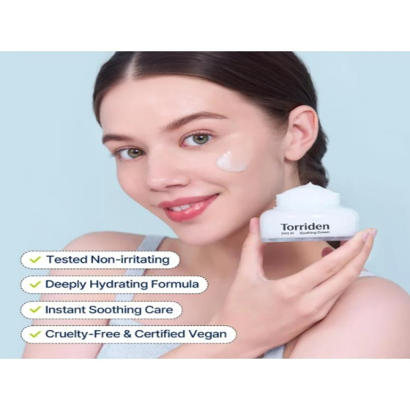 1. ضعي كمية صغيرة من كريم توريدن المهدئ على الوجه والرقبة بعد التنظيف.