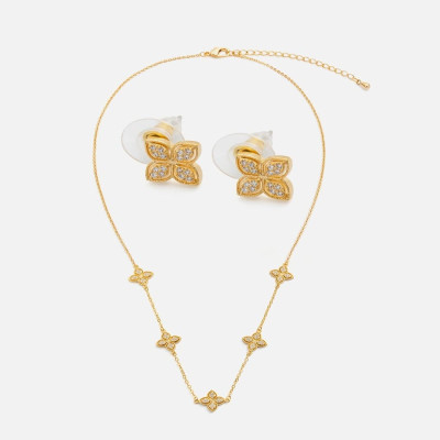 - يتميز الطقم بتصميم حلية بشكل ورود مرصعة بفصوص الزركون البراقة تضفي لمسة من الجاذبية