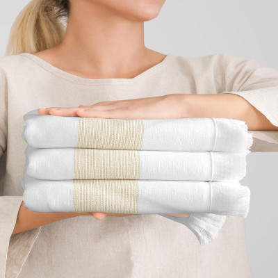 - و تتميز المناشف بتصميمها الفاخر بتداخل اللون الأبيض والبيج