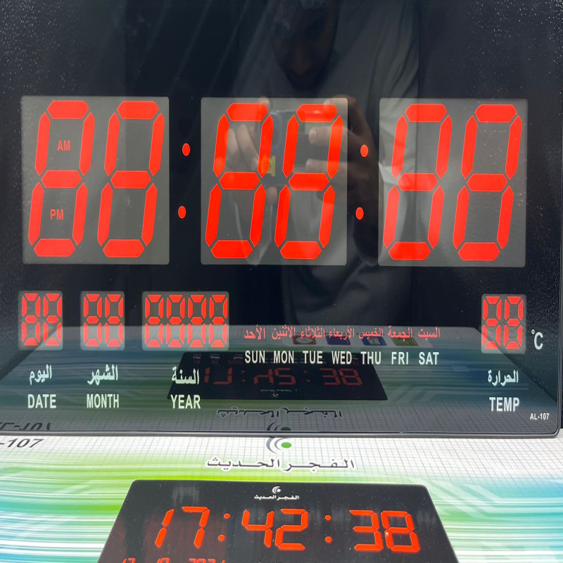 ساعة رقمية حائطية أنيقة ومميزة من الفجر الحديث، تجمع بين البساطة والوضوح في عرض الوقت والمعلومات الأساسية.