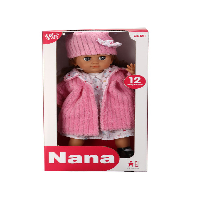 عروسة نانا أنيقة ترتدي فستان وردي جميل مع قبعة مطابقة،