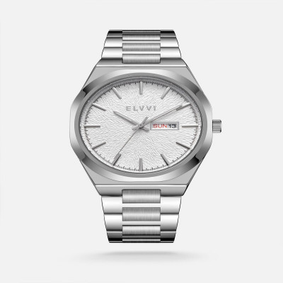 ساعة رجالية من ماركة إلڤي بتصميم كلاسيك عملي ، ساعة بسير من الستانلس ستيل باللون الفضي ، تتميز الساعة بتصميم الميناء الواسع باللون الأبيض وبإطار عريض و بنافذه صغيرة لعرض اليوم والتاريخ التي تزيد من أناقة الساعة ، أضيف الساعة الى مجموعة ساعاتك الفاخرة وعزز أناقة طلتك بإرتدائها . ضمان سنة